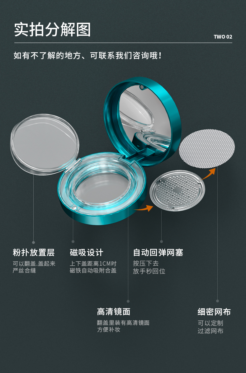 這款磁吸氣墊盒包材注塑件,帶了替換裝,還可以定做回彈網(wǎng)布和網(wǎng)塞,顏色和logo均可定制。