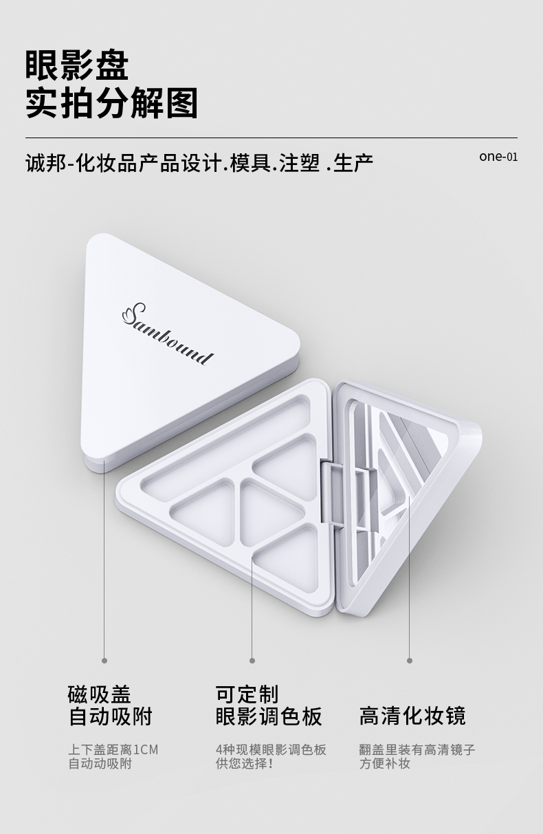 這款三角形磁吸眼影盤特點:獨特的三角形外觀、磁吸開關設計、可定制logo圖案