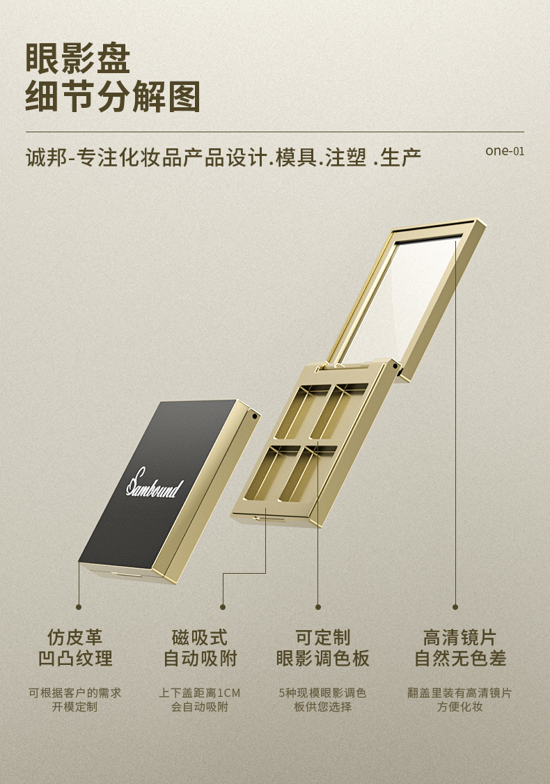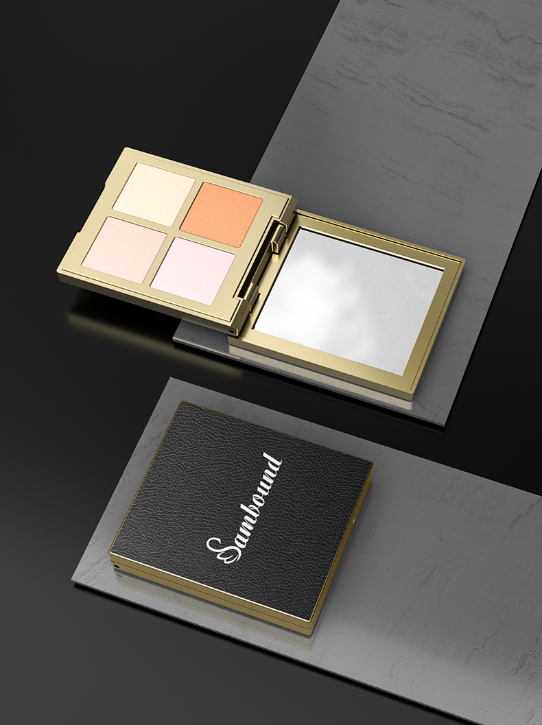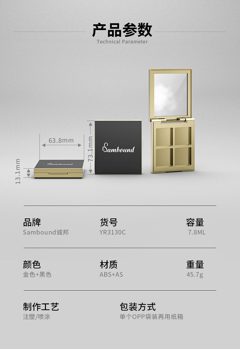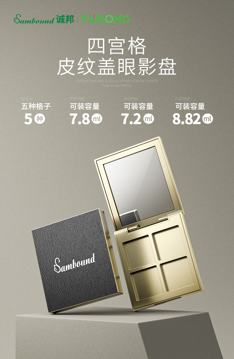 定制四格皮紋蓋眼影盤空盒包裝表面采用皮紋蓋,內部金色電鍍更顯奢華。