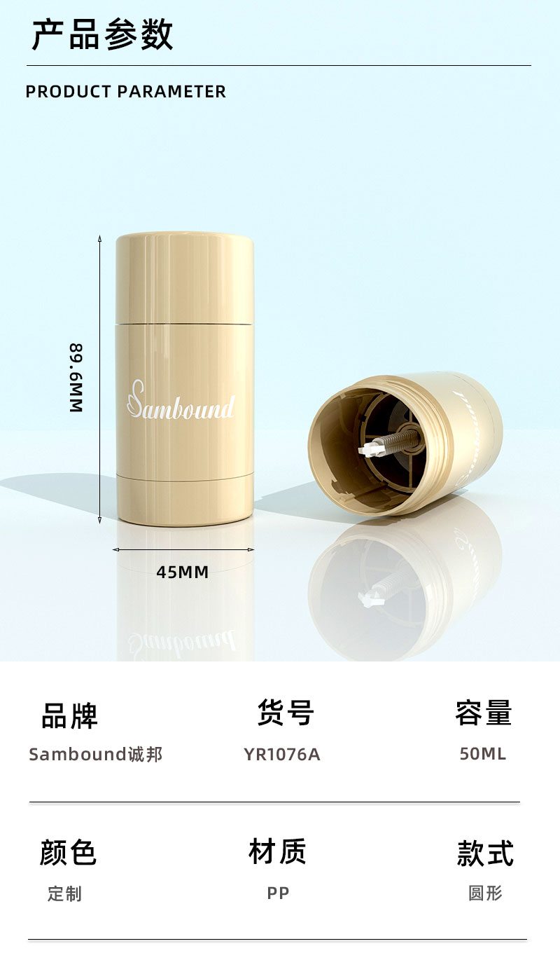 產(chǎn)品名稱止癢棒包材產(chǎn)品貨號YR1076A容量50ML顏色可定制材質(zhì)PP重量32 9g制做工藝注塑 噴油 真空電鍍包裝方式單個OPP袋裝再用紙箱